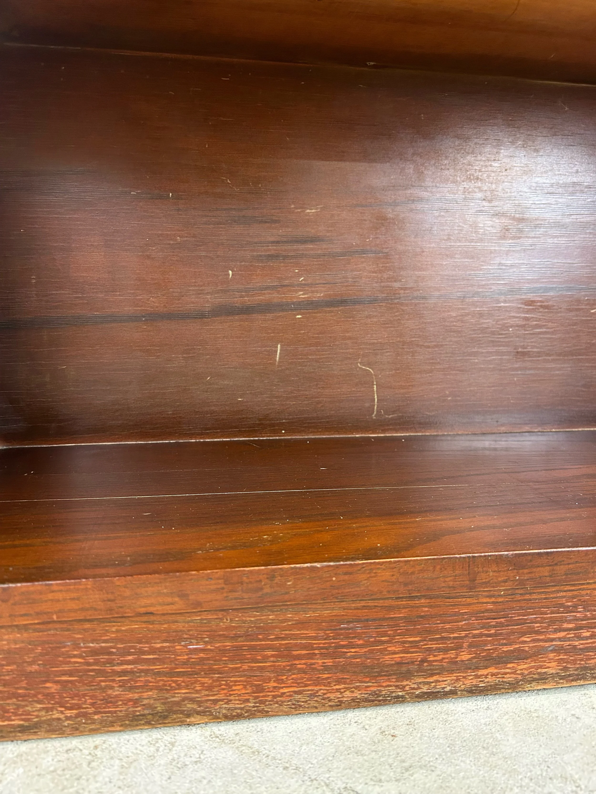 Condition: Original finish has minor scuffs, scratches, some discoloration. There are three small screw holes where a previous owner had a pencil sharpener mounted (see photo). The backing panel has been reattached at some point. Overall sturdy, solid vintage shelving. Ready for many more years of service. 7.5/10