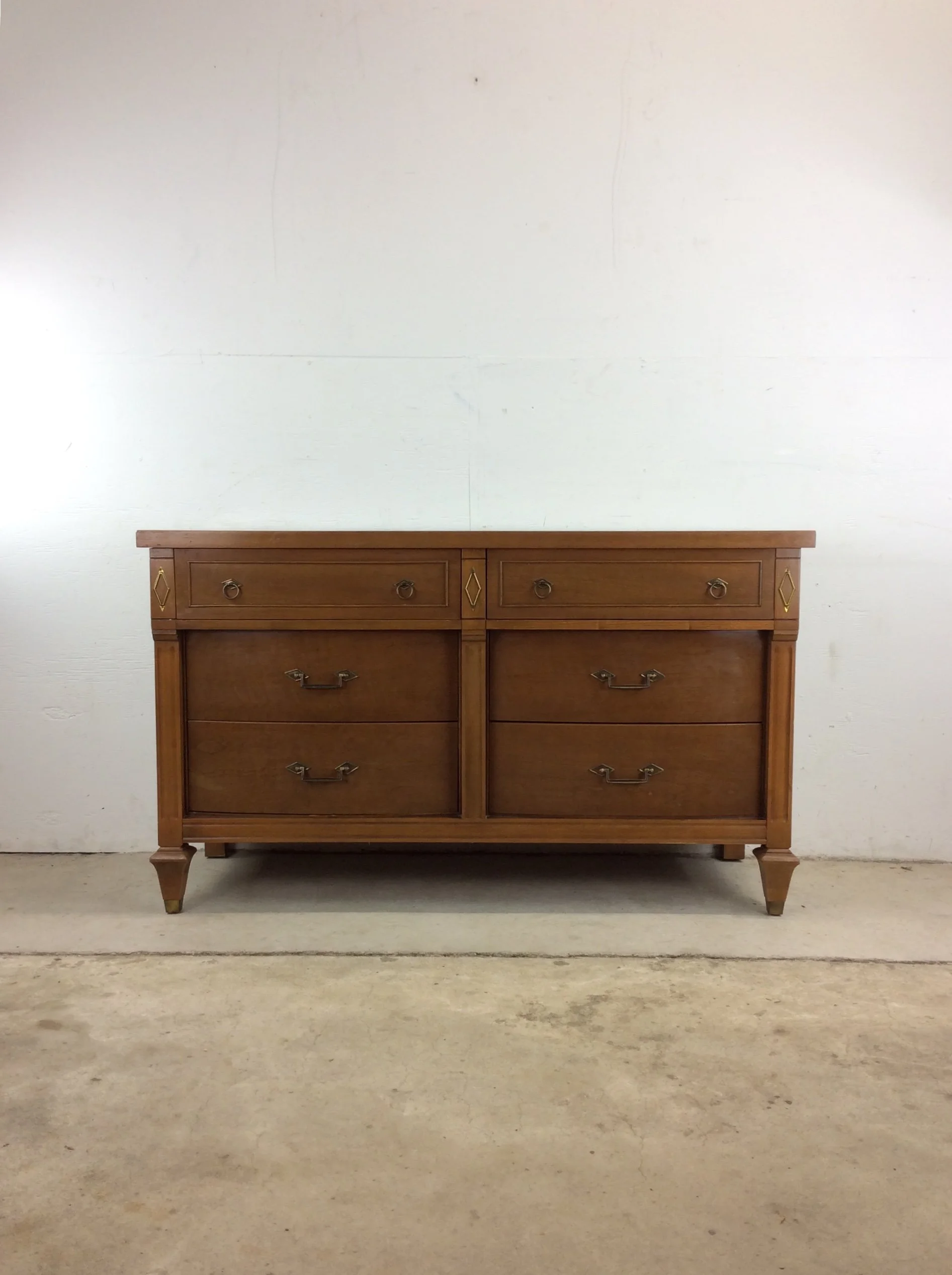This mid century modern lowboy dresser features hardwood construction, walnut veneer with original finish, six dovetailed drawers with brass hardware, inlaid diamond shapes made of brass, and sculpted brass capped feet.