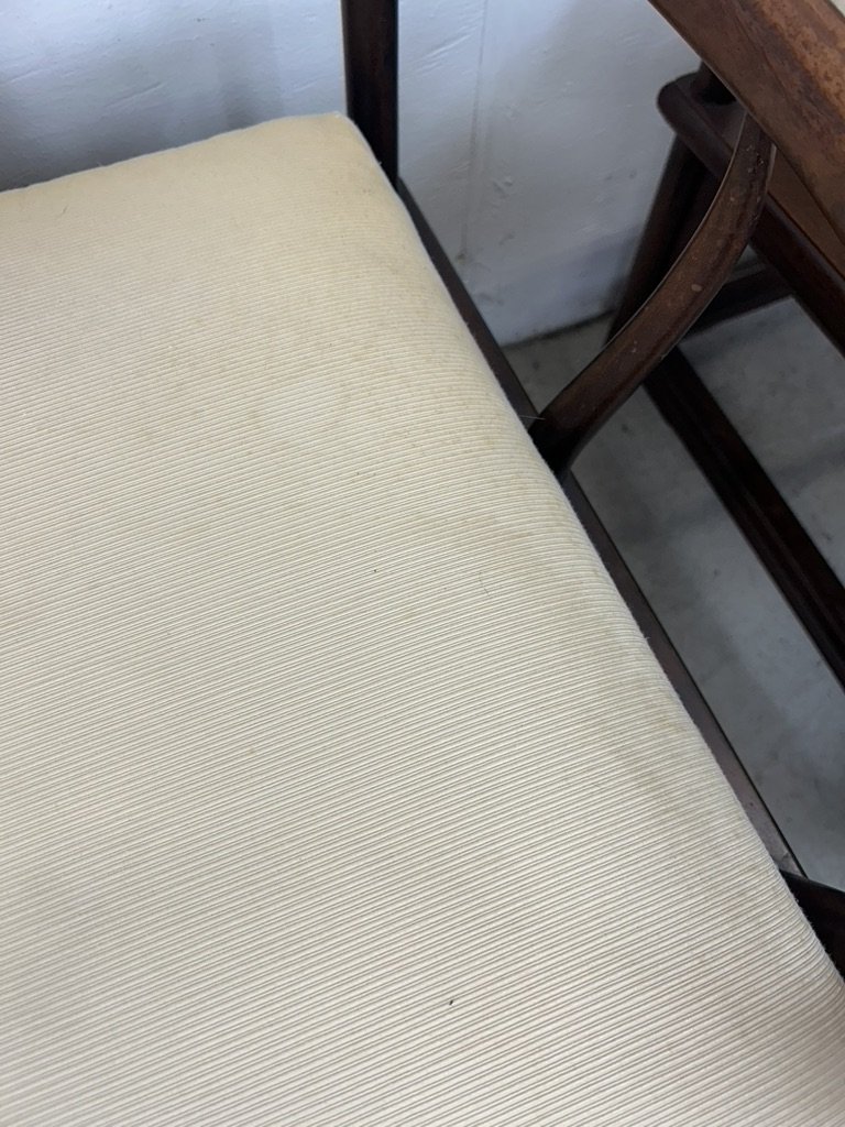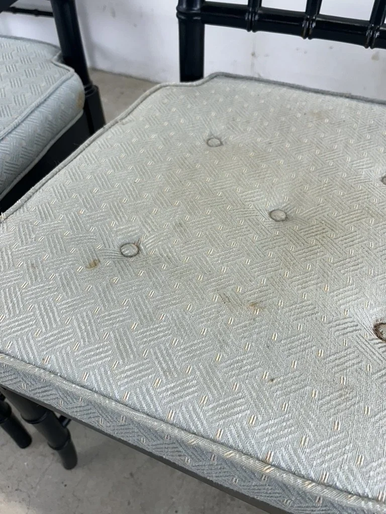 Condition notes: Black paint on these chairs shows considerable wear on the arms. Some of the caned seats have wear including a hole. Vintage upholstered cushions show their age. Faded, matted down, lightly soiled. Please inspect photos carefully. 7.5/10